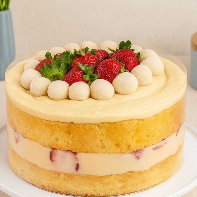 Bolo de aniversário (aprox. 1,3kg) perfeito para 6 a 8 pessoas. Feito com massa de baunilha super macia e molhadinha, ele esconde uma deliciosa surpresa de morangos frescos no recheio. Entre as camadas, um brigadeiro suave de leite ninho com morango traz aquela cremosidade que conquista no primeiro pedaço. No topo, uma finalização caprichada com brigadeiros cremosos de leite ninho e morangos inteiros, deixando o visual ainda mais especial. É o bolo ideal para aniversários, homenagens e presentes — aquele clássico lindo, gostoso e marcante que sempre salva quando você precisa de algo rápido, mas impecável. Uma escolha que impressiona pelo sabor, pela beleza e pelo cuidado em cada detalhe.