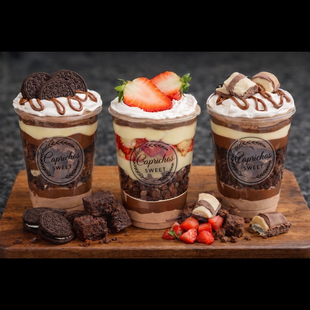 Copos da Felicidade – Caprichos Sweet Uma explosão de sabor em cada camada! Nossos copos da felicidade são preparados com muito carinho, unindo cremosidade, recheios irresistíveis e combinações que agradam todos os paladares. Aproximadamente 200ml podendo escolher seu sabor e todos os sabores finalizado com chantininho cremoso