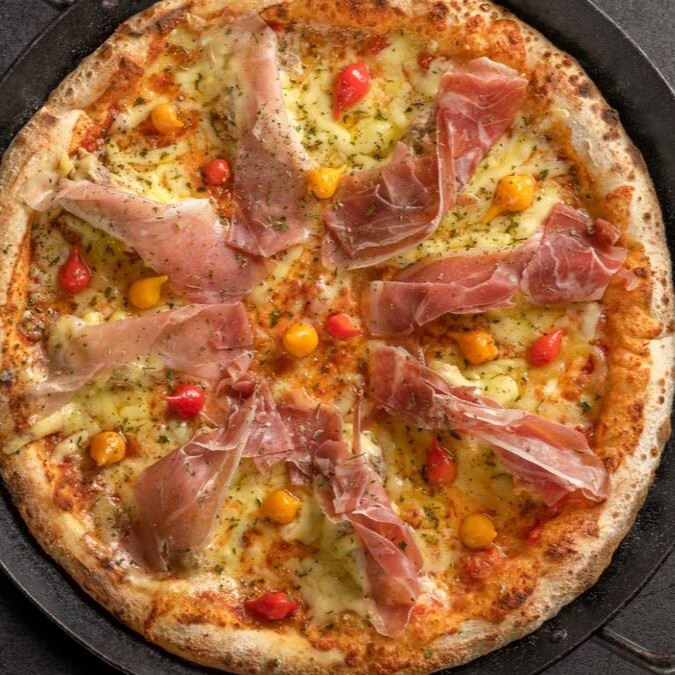 Generosa Porção de molho de tomate especial e porção extra de mozzarella, servidos com 220g de mignon especialmente preparados com lascas de parmesão, envoltos em fatias de presunto parma e pimenta biquinho. Pizza Grande - 8 fatias
