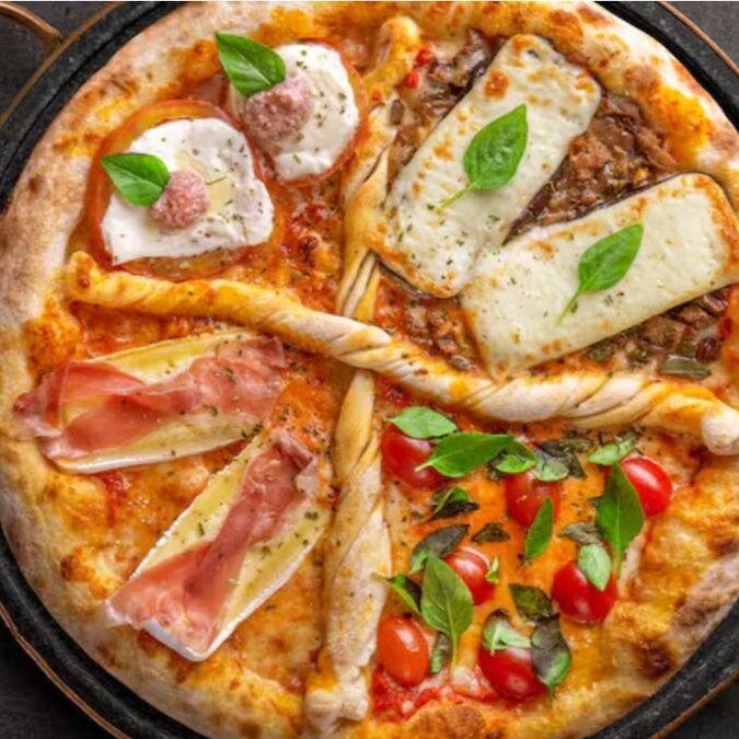 Esta pizza é assim chamada porque ela é dividida em 4 sabores pré determinados: Marguerita, Carmela, Roma e Caprese: Marguerita: Mozzarela, Molho, Tomate Cereja e Manjericão Fresco. Carmela: Mozzarella, Molho, Berinjela, Caponata de Berinjela Agridoce, Mozarella de Búfala e Folhas de Manjericão. Roma: Mozzarella, Molho, Queijo Brie, Coberta com Fatias de Presunto Parma. Caprese: Molho, rodelas de tomate caqui, mozzarella de búfala e pesto de azeitonas pretas e basílico. (Molho de tomate, rodelas de tomate caqui, mussarela de búfala, pesto de azeitonas pretas e manjericão.)