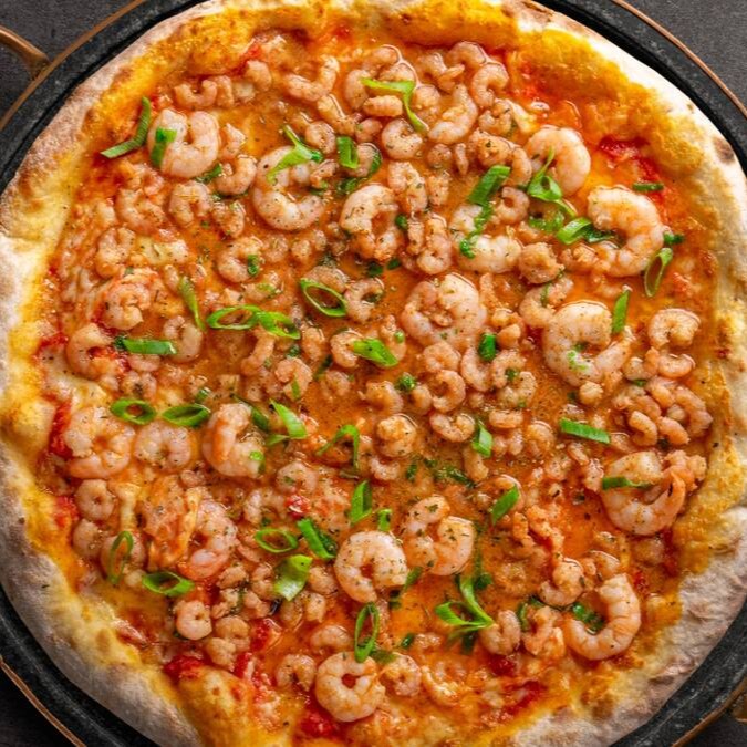 Uma Pizza Coberta com Molho de Tomate, Mozzarella, Cogumelo Paris, Camarões (300g) Salteados ao Fogo Temperados ao Alho e Cebolinha Fresca.