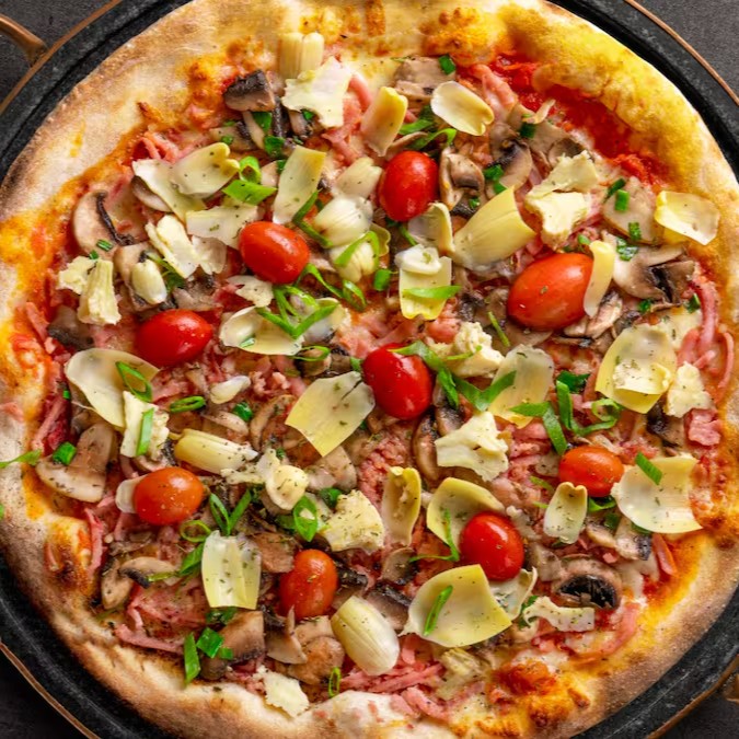 Molho, mozzarella, presunto, alcachofra, tomate cereja e cogumelos Paris salteados no fogo com cebolinhas frescas