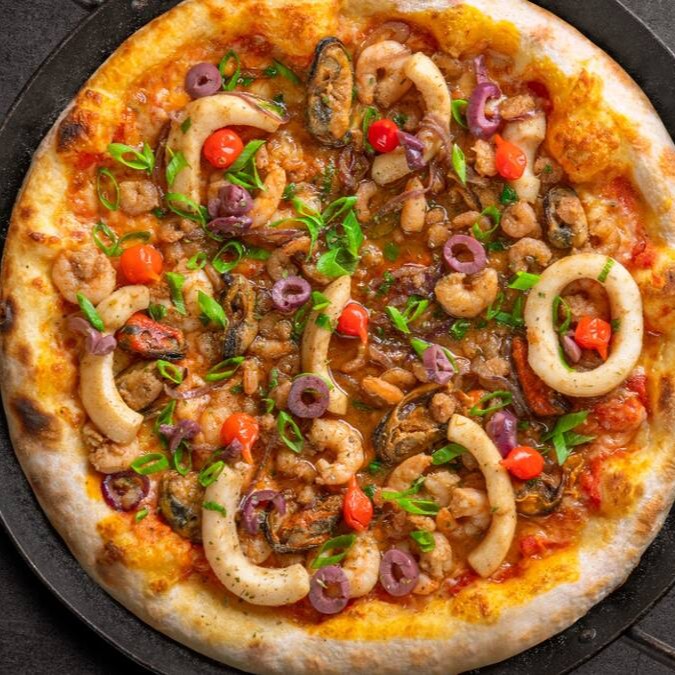 Mais uma das nossas obras de arte culinárias também muito requisitada, pizza de 450g de frutos do mar, camarão e mexilhão, salteados no fogo no tacho de ferro juntamente com cebolas roxas, cheiro verde, pimenta biquinho e azeitonas pretas. Pizza grande 8 fatias! Prove esta delícia!!!