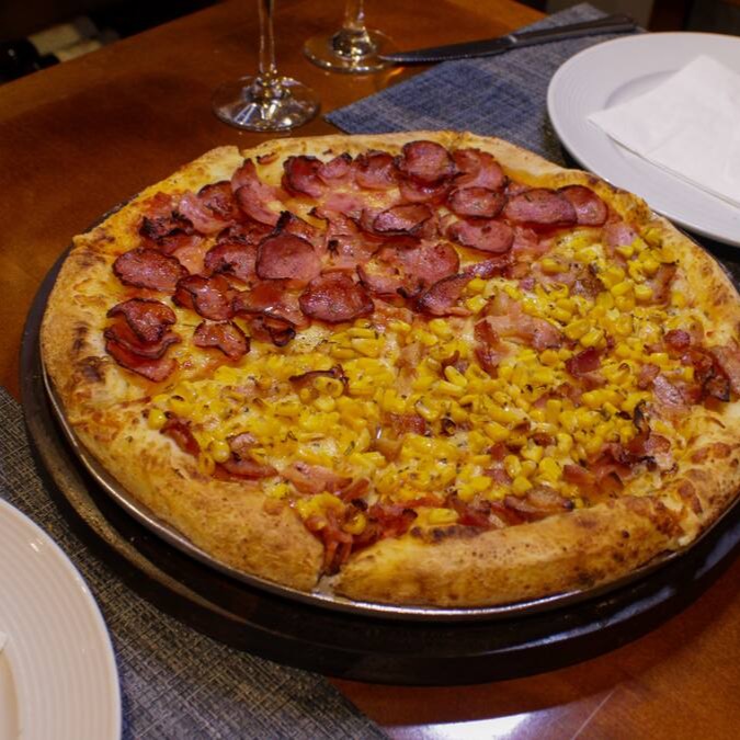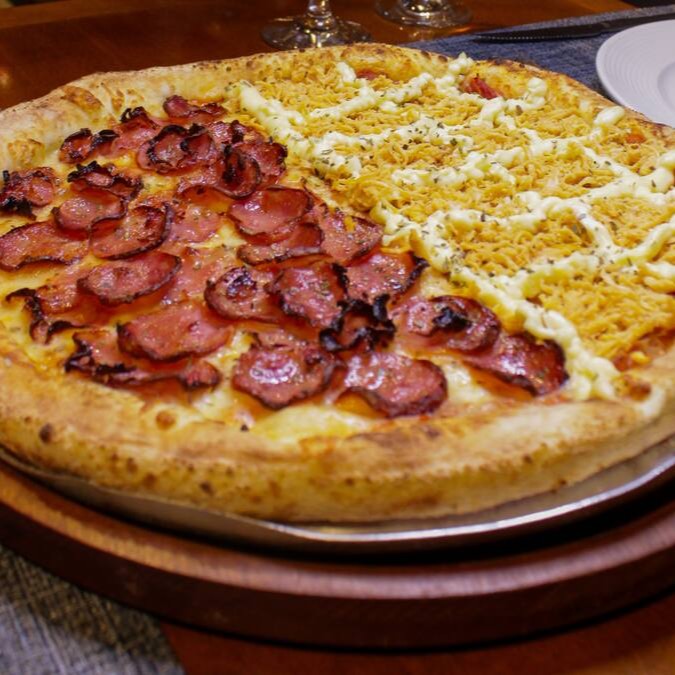 Mozzarella, molho, cogumelos Paris e linguiça Bizinelli reduzida no tacho de ferro e cebolinhas frescas.
