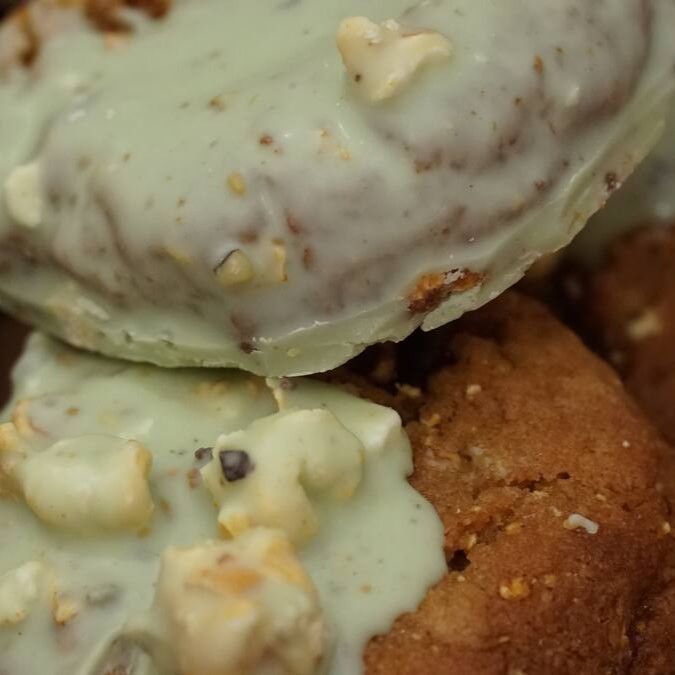 Massa de cookie com pipoca sabor leite Ninho e trufa pura de pistache, finalizado com cobertura de chocolate branco e pedaços de pipoca. Elegância em cada mordida.