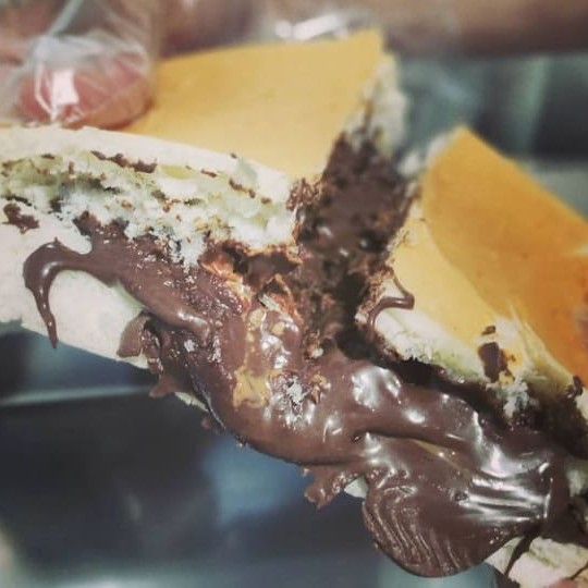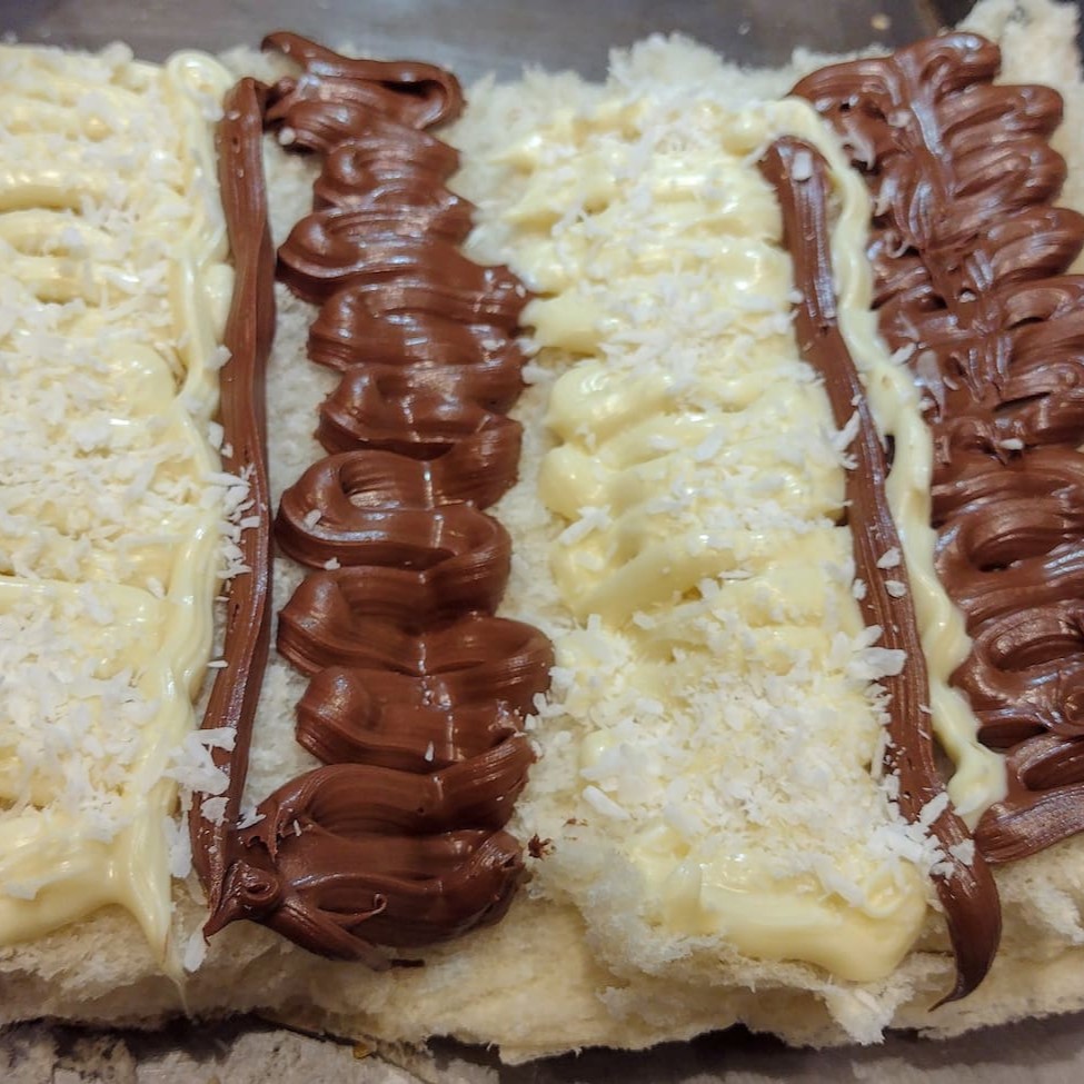 Pão de hot dog, chocolate preto ou branco, paçoca