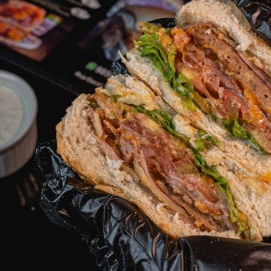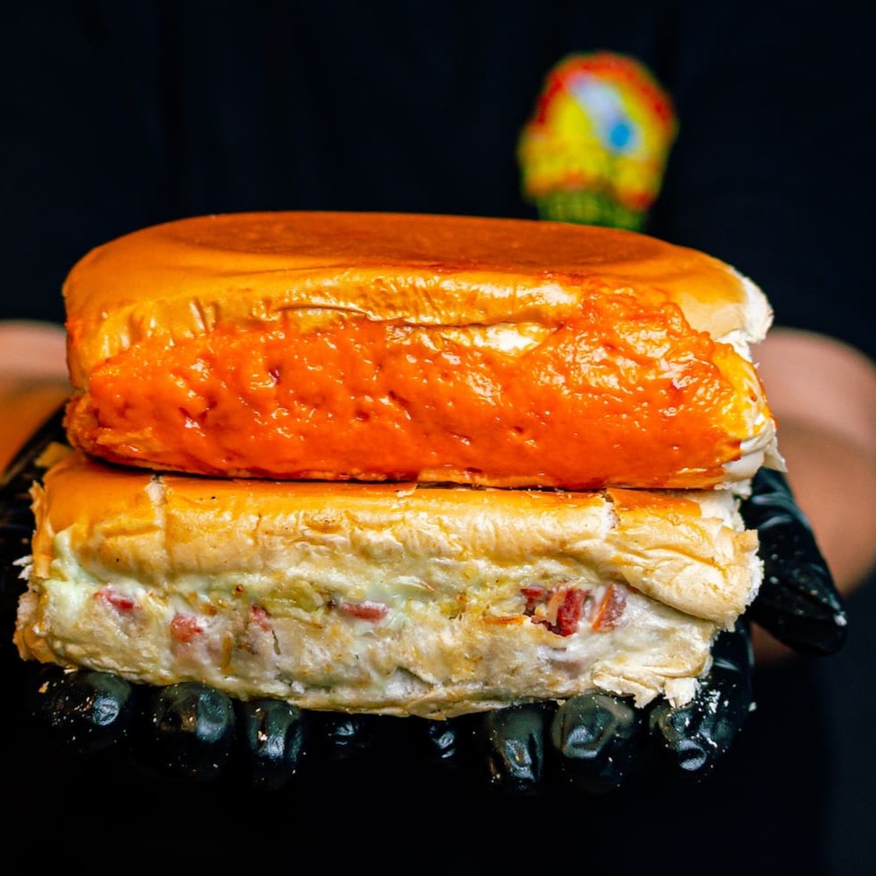 Pão Argola,1hamburguer, bacon,(Cheddar Ou Catupiri) queijo mussarela, presunto, tomate, alface, maionese caseira, maionese tradicional e maionese verde.