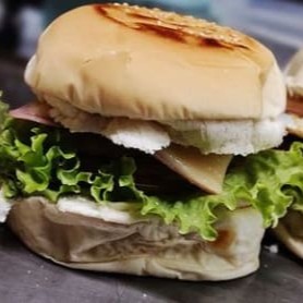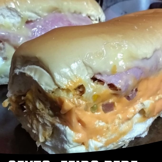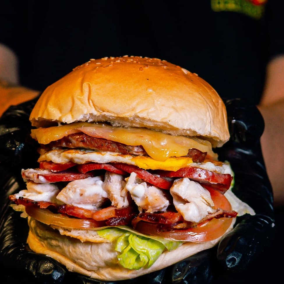 Pão Argola,1 hambúrguer, frango, bacon, calabresa,ovo,queijo mussarela, presunto, alface, tomate, maionese caseira maionese tradicional e maionese verde.