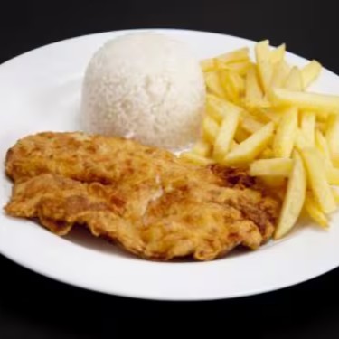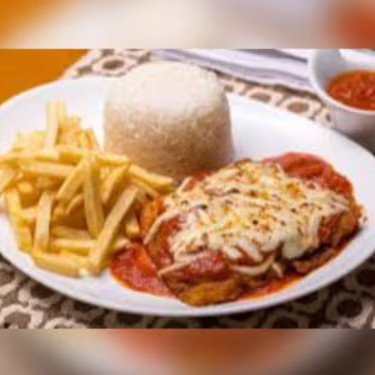 Bife de Contra-Filé à Parmegiana (250gr), acompanha 250gr de arroz branco e 150gr de batata frita.