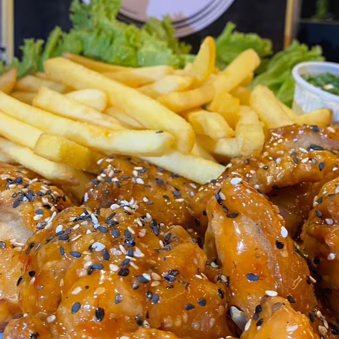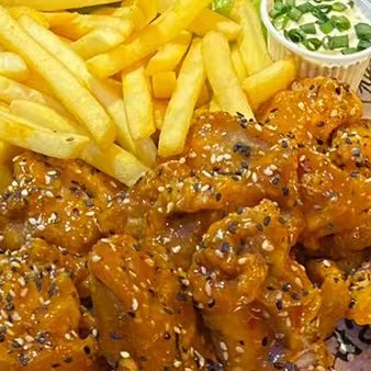 Coxinha da Asa ou Iscas de Peito de Frango empanada no trigo, frita, merguhada em um delicioso molho agridoce levemente picante coberto com mix de gergelim - Acompanha 250g de batata frita.