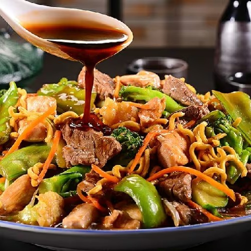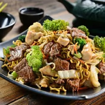 Yaki misto de carne e frango com macarrão cozido, legumes e molho especial da casa.