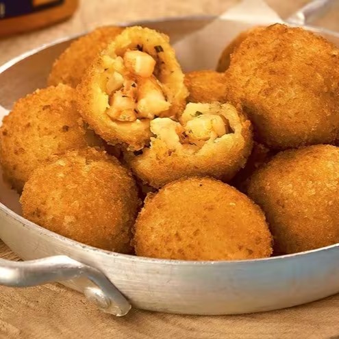 Bolinho de Camarão, com muito camarão, empanado e frito, acompanha maionese caseira da casa. 8 unidades.