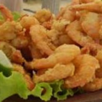 Camarão branco sem cabeça, com casca empanado no trigo e frito, acompanha maionese caseira da casa. 500gr
