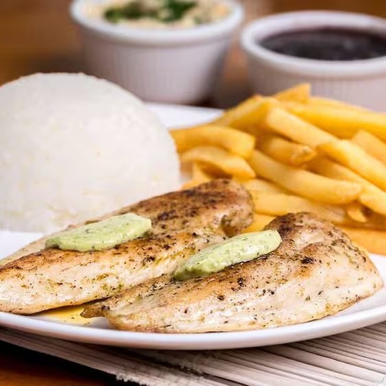 Filé de Tilápia com molho de camarão (250gr), acompanha 250gr de arroz branco e 150gr de batata frita.