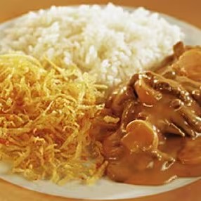 250 gr de Strogonoff super cremoso com champignon, acompanha 250gr de arroz branco e batata palha extra fina.