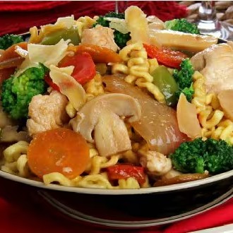 Tiras de alcatra com legumes, macarrão cozinho e molho especial da casa.