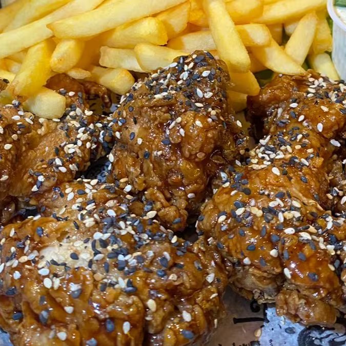 Coxinha da Asa ou Iscas de Peito de Frango empanada no trigo, frita, merguhada em um delicioso molho oriental a base de Tonkatsu, Teryaki e Barbecue, coberto com mix de gergelim - Acompanha 250g de batata frita.