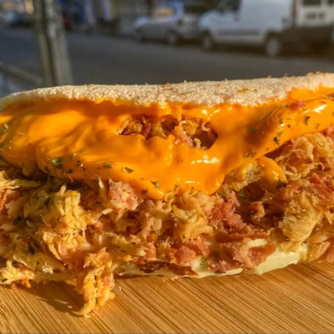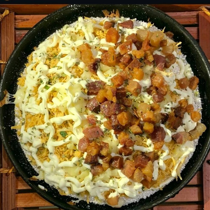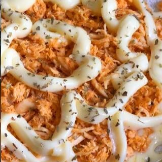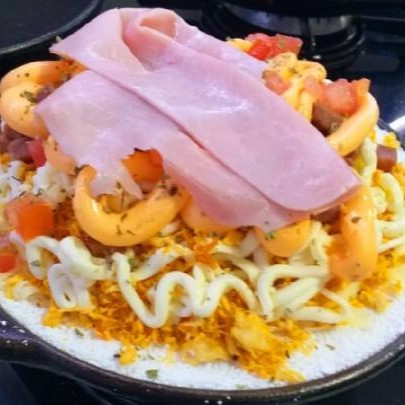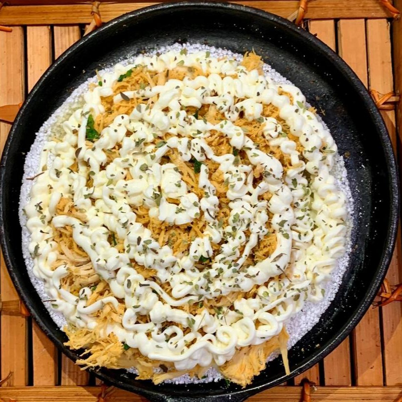 Frango Desfiado suculento, Calabresa Ralada, Queijo Mussarela, Requeijão e Cheddar.