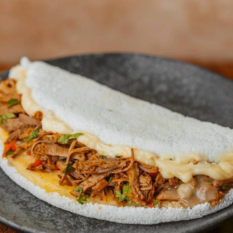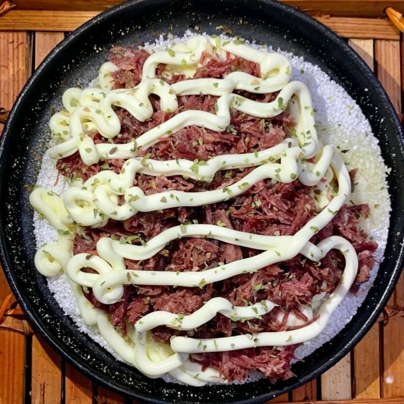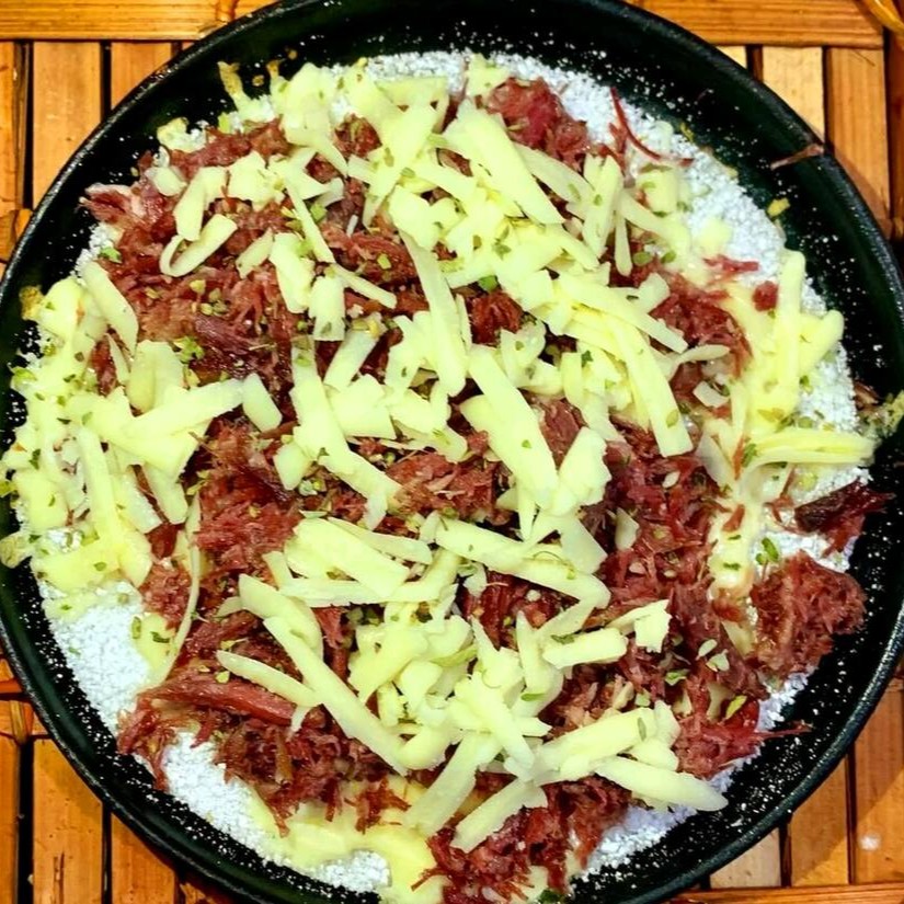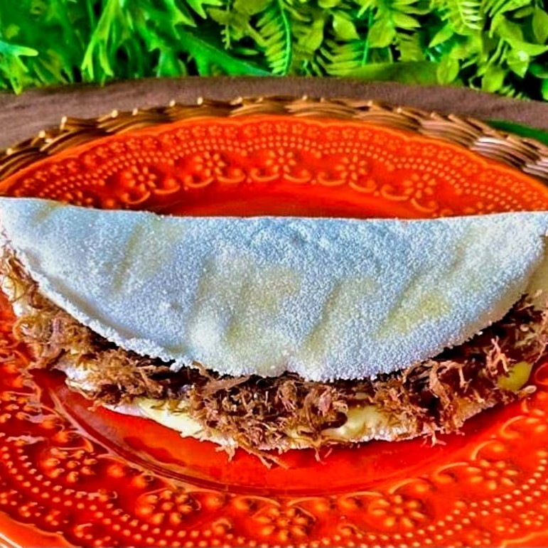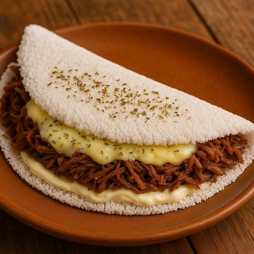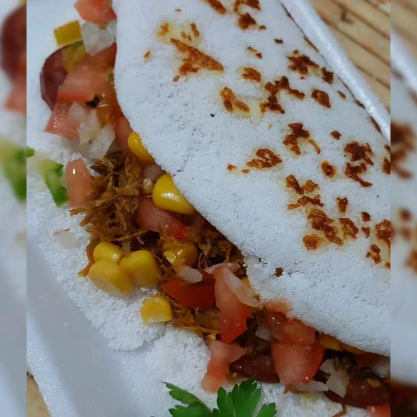 Deliciosa Tapioca Feita com Massa 100% Artesanal, tomate, carne de sol desfiada e queijo mussarela.