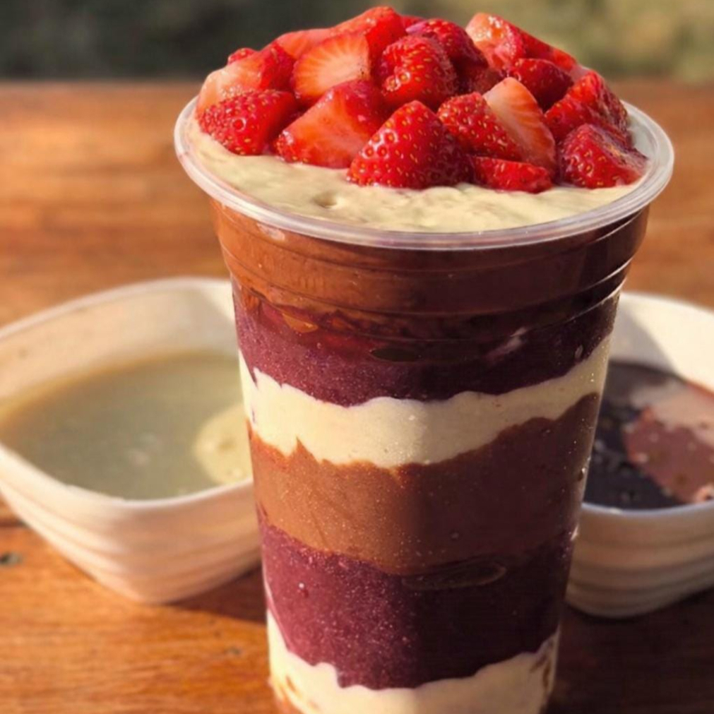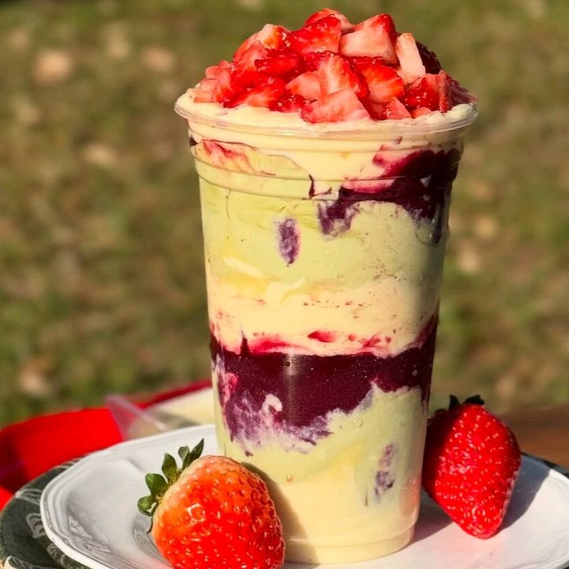 Açaí Cremoso com Leite Ninho, Leite condensado e Morangos orgânicos. Uma explosão de Sabores.