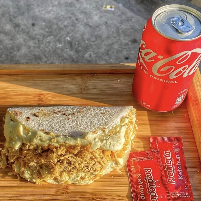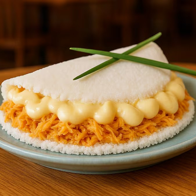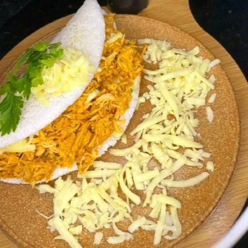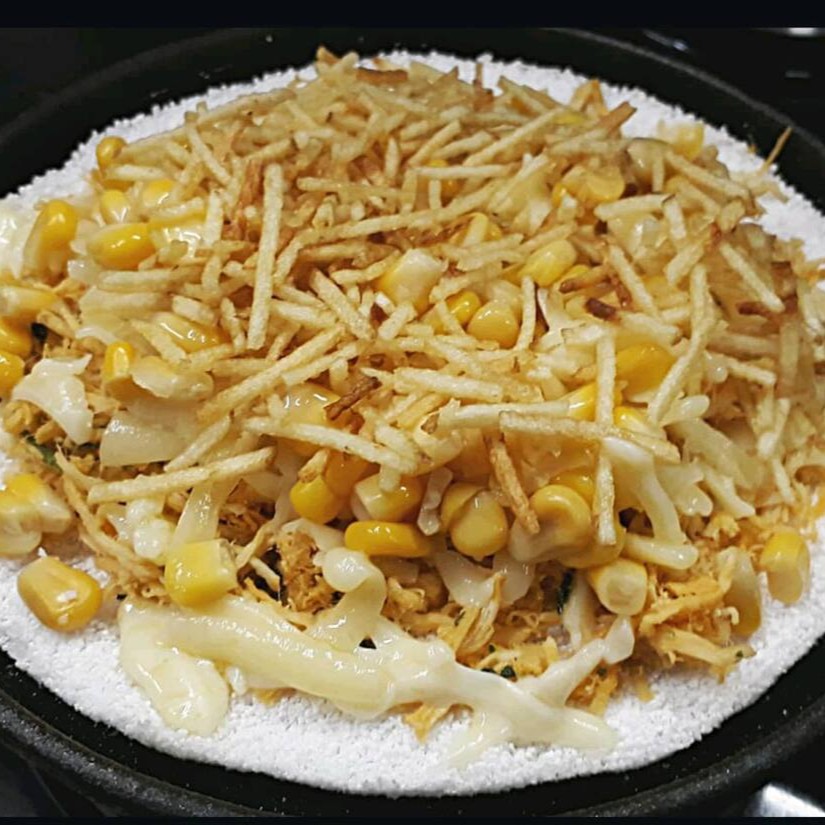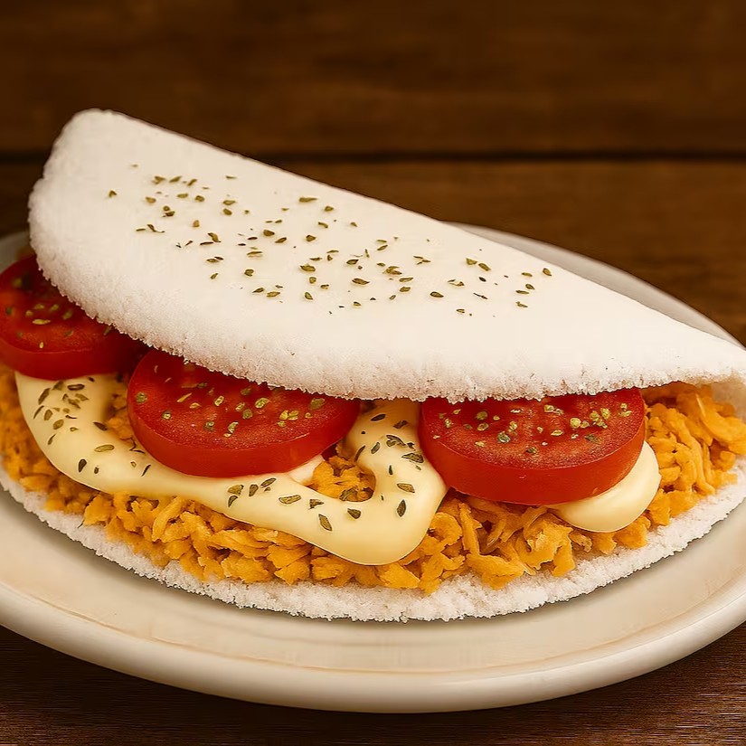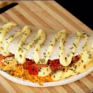 Massa de Tapioca 100% Artesanal. Delicioso Frango Desfiado e Suculento, Milho, Queijo Mussarela Derretido e Batata Palha;