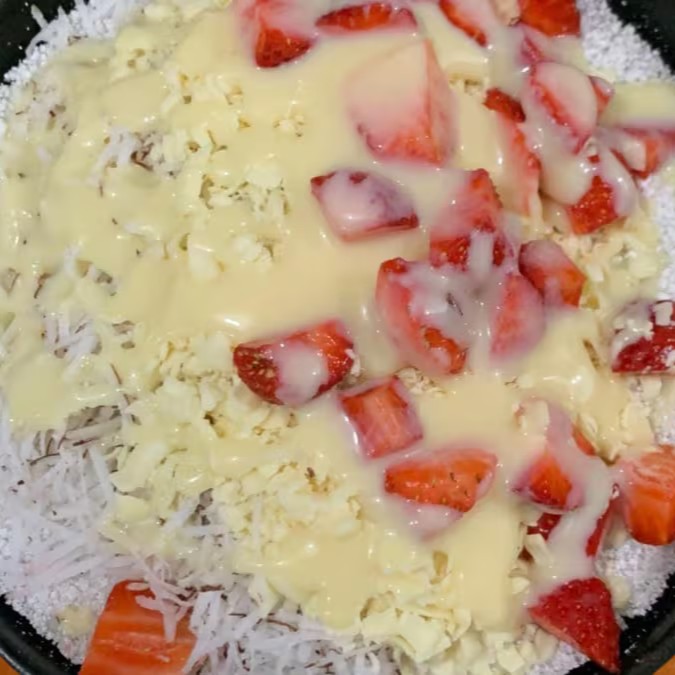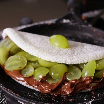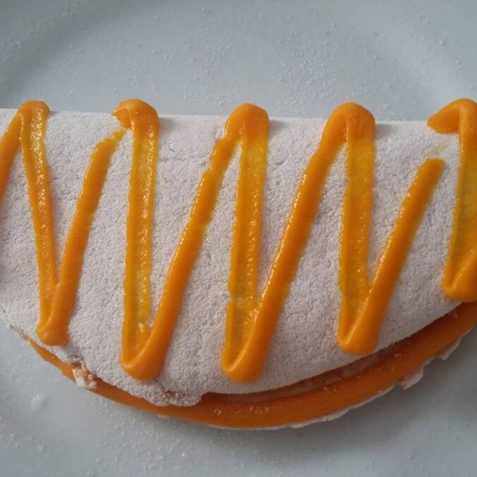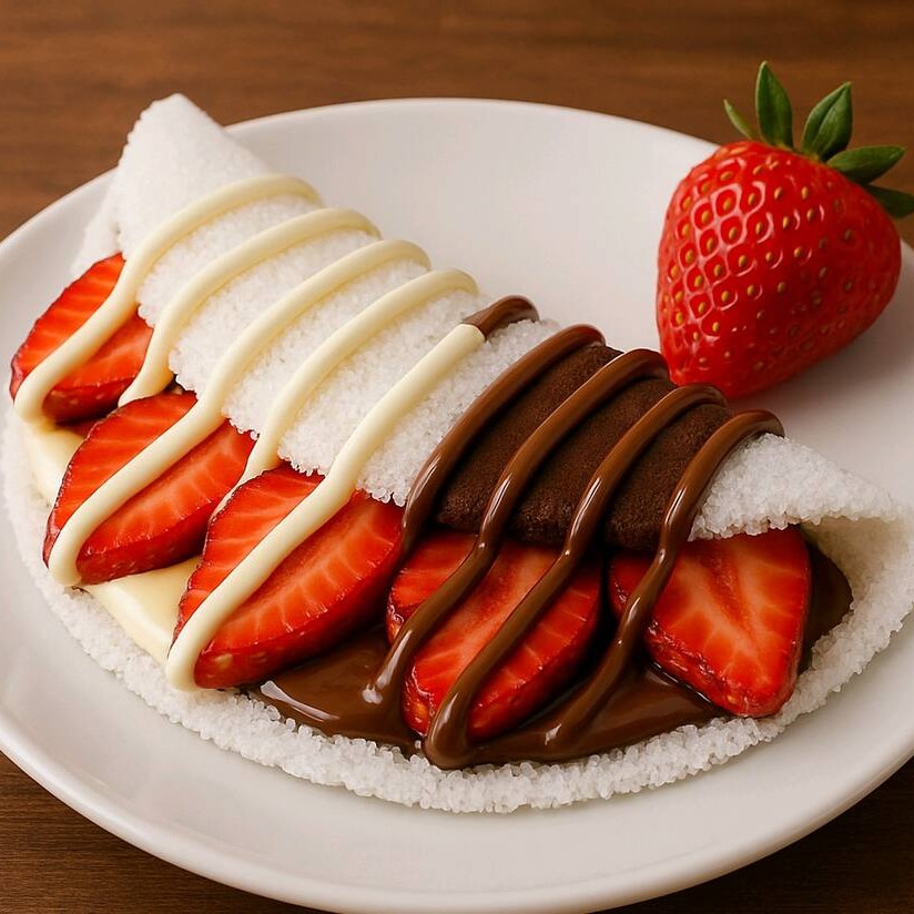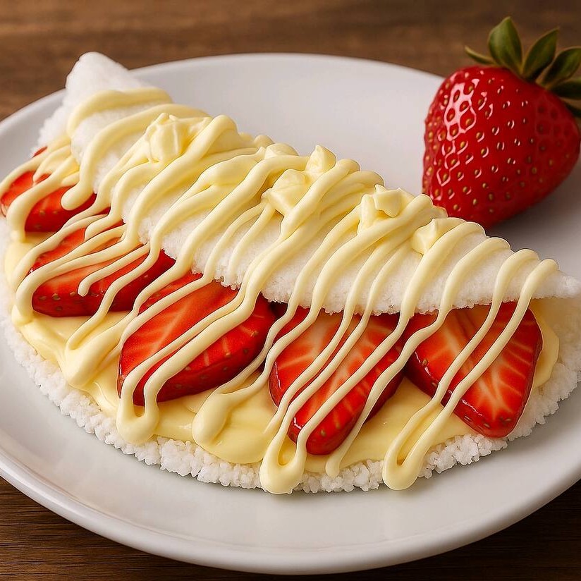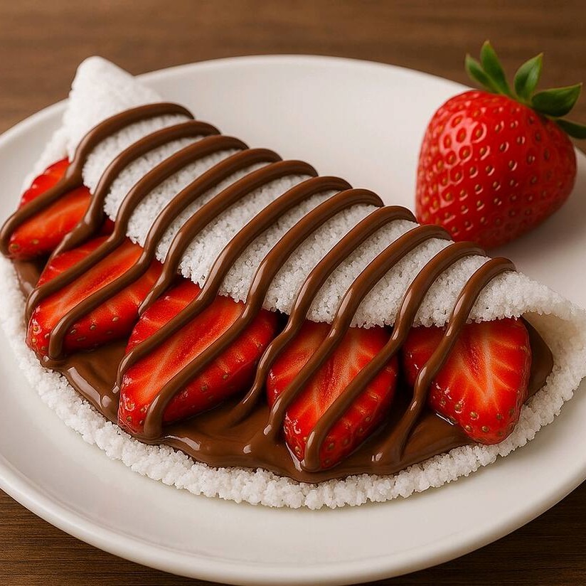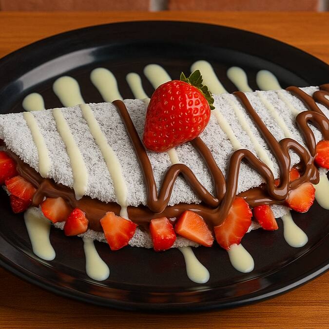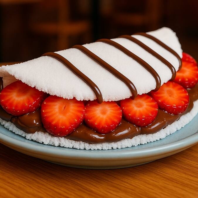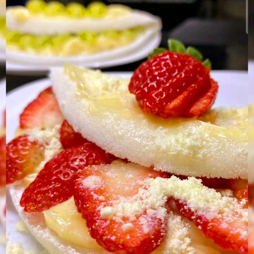 Farinha de Tapioca Artesanal recheada com um delicioso Creme de Leitinho com Morango ou Uvas verdes Polvilhada com leite em Pó Ninho.