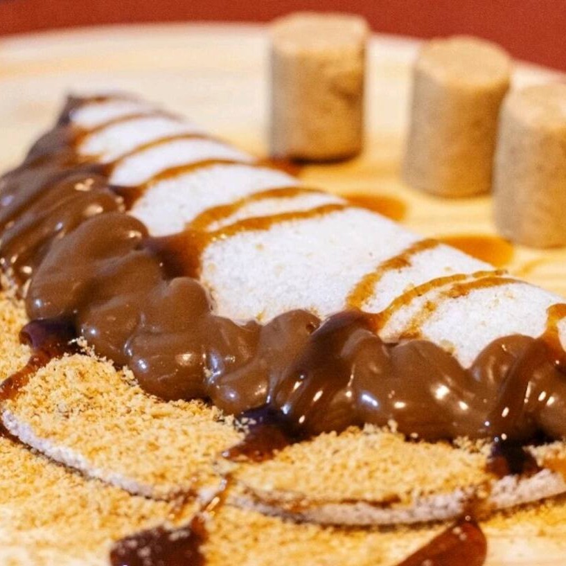 Massa de Tapioca 100% Artesanal, Doce de Leite Puro, Banana e Pitada de Canela.