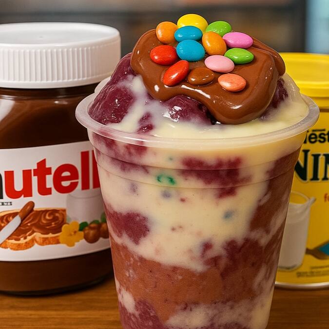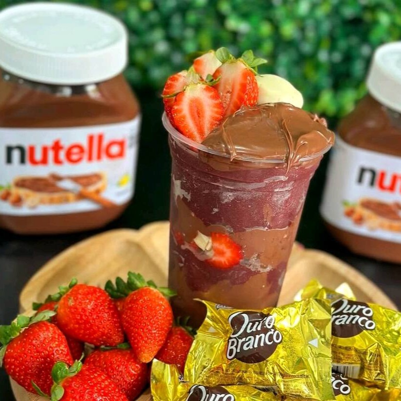 Delicioso Açaí Super Refrescante com Deliciosa Nutella Original, Leite em pó Ninho, Leite Condensado e Morangos orgânicos.