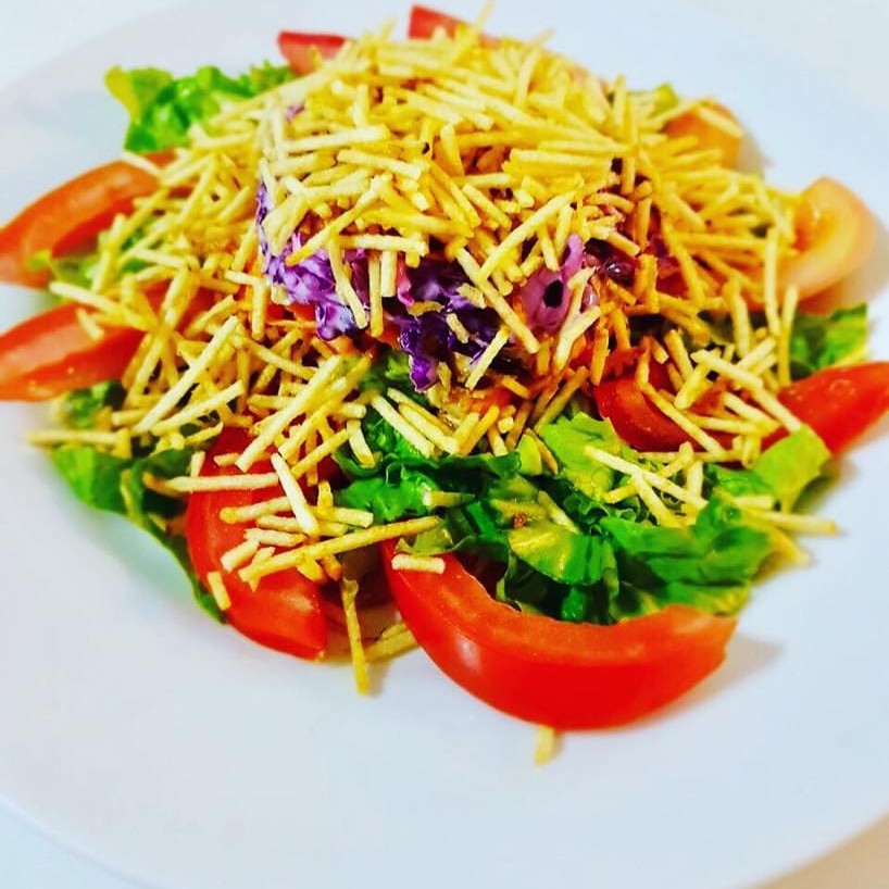 Alface tomate maionese com cenoura, repolho roxo e frango desfiado batata palha