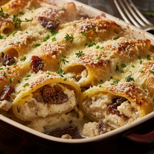 Massa artesanal em formato de grandes conchas, recheio sofisticado e cremoso de ricota fresca com pedaços de figo selecionados, servida ao molho branco aveludado ou manteiga e sálvia, finalizada com nozes picadas e queijo parmesão ralado para um equilíbrio perfeito entre o doce e o salgado.