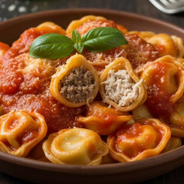 750gr de massa artesanal em formato de capelette recheio frango desfiado com temperos da casa, servido ao molho suculento de tomates pelados ou em caldo aromático (brodo), finalizado com queijo parmesão ralado e salsinha fresca.
