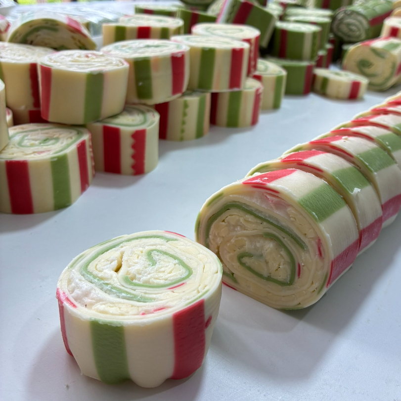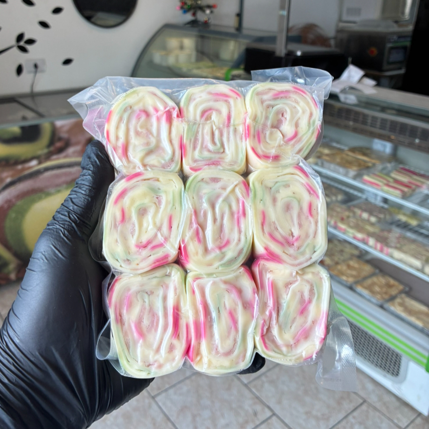 Rondelli com massa colorida recheada com queijo mussarela e requeijão.