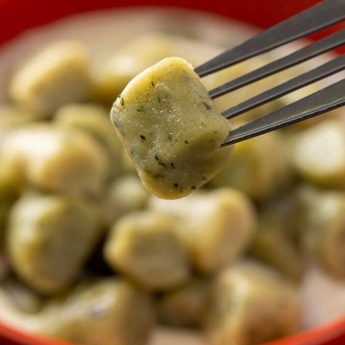 Nhoque de Ricota com Espinafre peso: aproximadamente 1kg serve 2 pessoas embalagem para aquecimento no forno ou micro-ondas