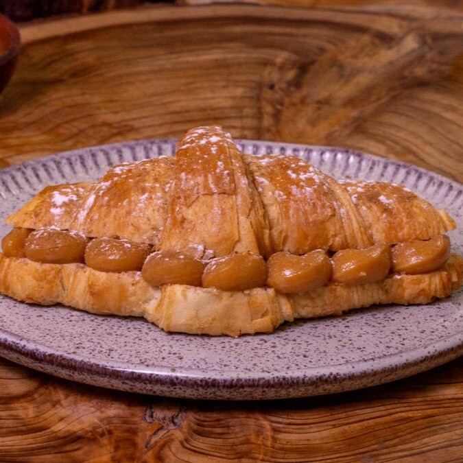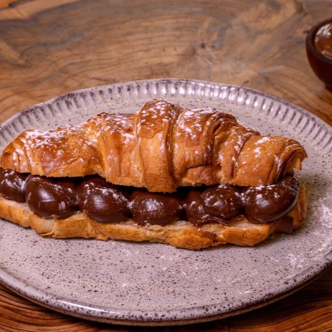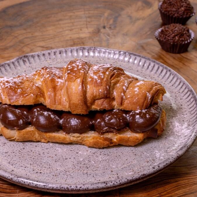 Sinta-se encantado com o nosso croissant recheado com Brigadeiro Moça da Nestlé. Este é um irresistível croissant, crocante por fora e incrivelmente macio por dentro. Seu recheio de Brigadeiro Moça da Nestlé traz um toque brasileiro, unindo a tradição francesa do croissant com o nosso querido brigadeiro. Prepare-se para uma explosão de sabor ao morder e sentir o brigadeiro derretendo em sua boca. É uma verdadeira delícia que irá te surpreender a cada mordida. Ideal para um café da manhã indulgente ou um lanche da tarde saboroso. Experimente!