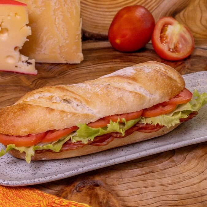 Delicie-se com nossa irresistível 'Baguete com Salame Italiano'. Um sanduíche de alto padrão, que apresenta uma baguete crocante e fresca, recheada com generosas fatias de autêntico salame italiano, suculentos tomates, alface crocante e uma camada de queijo mussarela derretido, tudo harmoniosamente unido por nossa exclusiva maionese caseira. Uma verdadeira obra-prima dos sanduíches que aguça o paladar e deixa uma vontade insaciável de quero mais!
