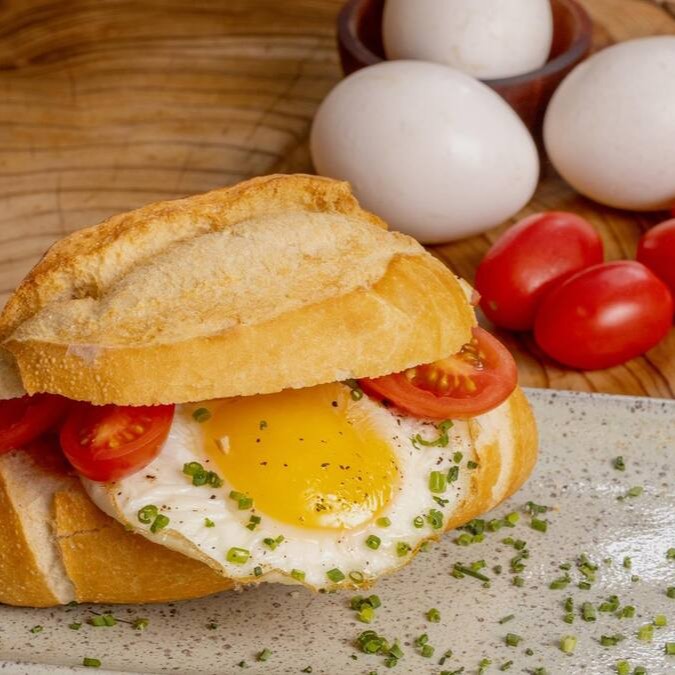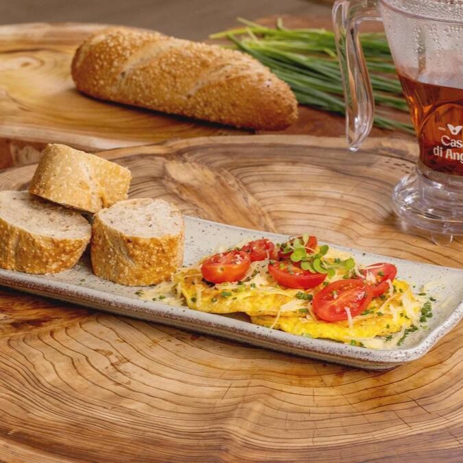 São 2 Omeletes, com tomate cereja e queijo, acompanha 3 fatias de baguete rústica.