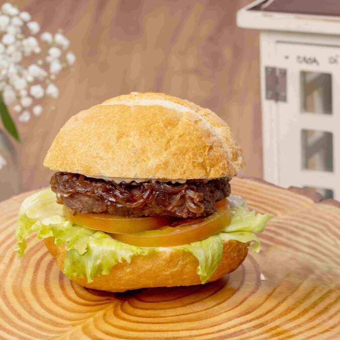 Nosso delicioso 'Hambúrguer no Pão Australiano' é uma experiência culinária irresistível. A suculência do hambúrguer é cuidadosamente equilibrada pela doçura da cebola caramelizada. Tudo isso é delicadamente acomodado em nosso pão australiano de primeira qualidade, famoso por sua textura única e sabor inigualável. Esta refeição é uma verdadeira viagem gastronômica, que combina ingredientes clássicos de uma maneira surpreendentemente deliciosa. Uma opção perfeita para os amantes de hambúrguer que procuram algo além do comum.