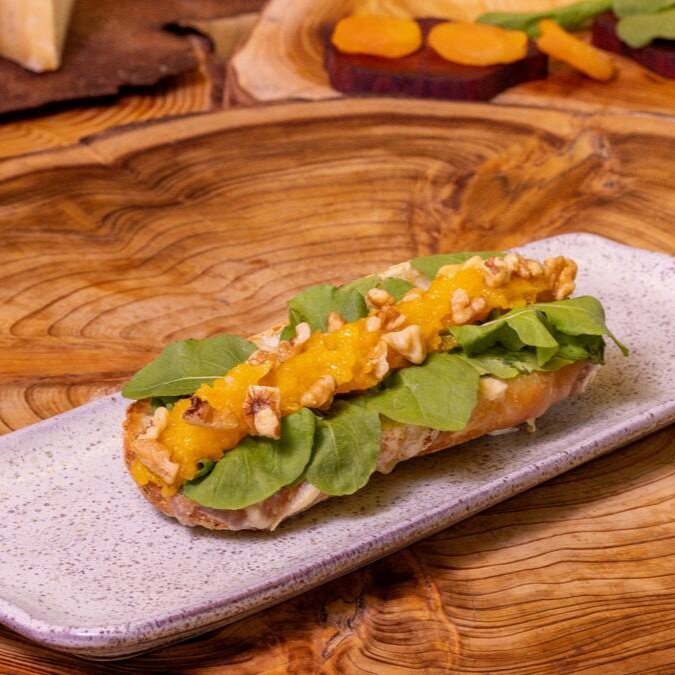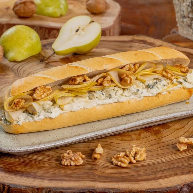 Desfrute de nossa requintada Baguete com Pêra, Nozes, Gorgonzola e Melado de Bracatinga. Esta delícia é meticulosamente preparada com fatias de pêra, harmoniosamente combinadas com o sabor robusto de nozes. Acentuamos esta sinfonia de sabores com queijo gorgonzola cremoso, que proporciona uma complexidade deliciosa. O toque final é dado por uma camada de melado de bracatinga, cujo dulçor se equilibra perfeitamente com uma pitada de flor de sal. Este é, sem dúvida, um sanduíche irresistível que transcende o comum, proporcionando uma experiência gastronômica única.