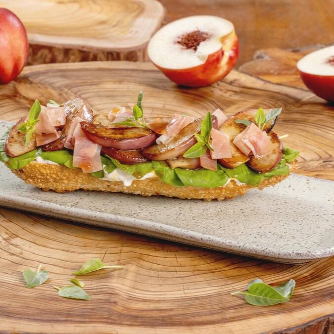A baguete ciabatta, crocante e fresca, abriga a doçura das nectarinas grelhadas no ponto certo, contrastando perfeitamente com a cremosidade suave da burrata. Para completar, adicionamos uma pitada de sabor marcante com nosso presunto de Parma autêntico. Uma verdadeira obra-prima culinária na categoria de sanduíches.