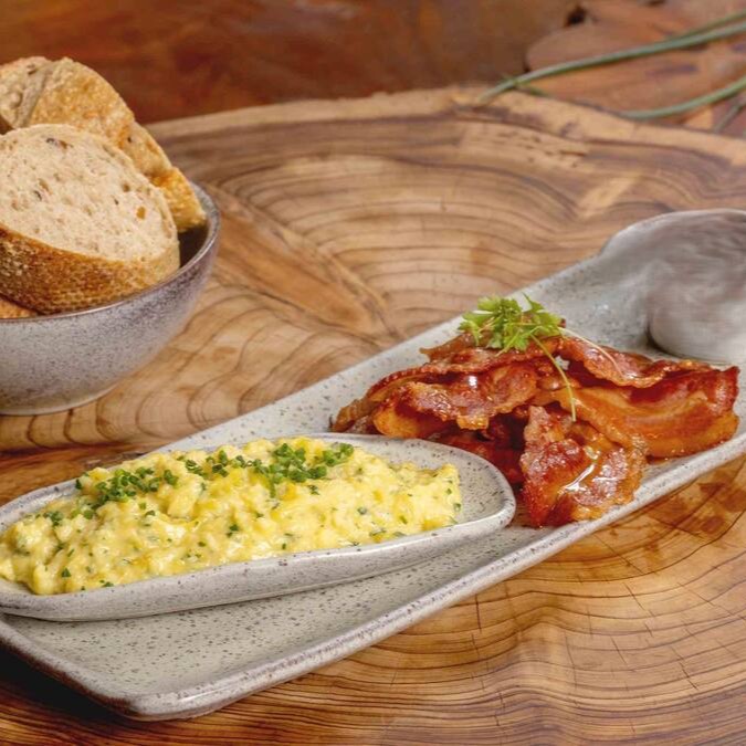 Ovos mexidos, com bacon fatiado, acompanha 3 fatias de baguete rústica