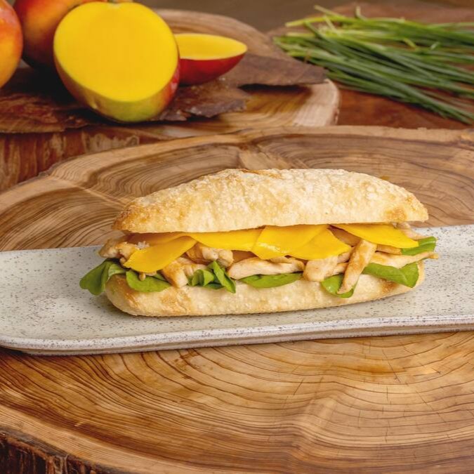 Experimente o irresistível Ciabatta de Frango com Manga e Rúcula. Este sanduíche é uma combinação perfeita de sabores, com o pão Ciabatta crocante e fresco, abraçando o frango suculento, o exótico sabor da manga madura, e o toque verde e picante da rúcula. Acrescentamos um molho Pesto caseiro, cheio de personalidade, que une todos estes ingredientes em uma sinfonia de texturas e sabores. Ideal para um almoço rápido ou um jantar descontraído.