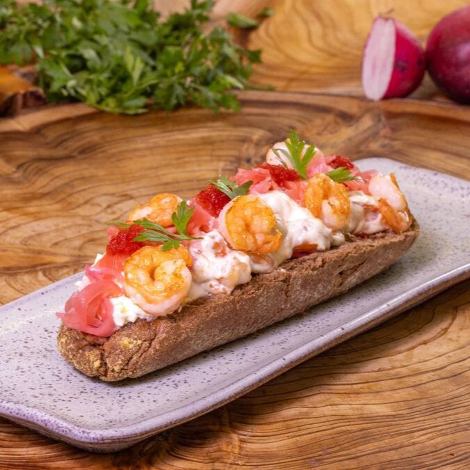 Apresentamos a nossa 'Baguete Australiana com Camarão Vanammei', uma tentação irresistível para os amantes de sanduíches. Esta delícia é recheada com o Camarão Vanammei, conhecido por sua textura macia e suculenta, combinado com o delicado creamcheese, que agrega uma cremosidade inigualável ao prato. A geleia de pimenta dá um toque apimentado, equilibrando perfeitamente com o sabor do camarão. Para finalizar, temos os picles de rabanete, que proporcionam um contraponto crocante e refrescante. Venha saborear essa exclusividade em nossa categoria de sanduíches.