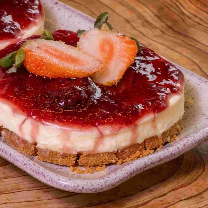 Este encantador Cheesecake, classificado como um dos melhores na categoria 'Sobremesas', apresenta uma cobertura tentadora de geleia de frutas vermelhas, intensamente saborosa. A sua cor brilhante, de um vermelho profundo, contrasta perfeitamente com a base cremosa do cheesecake. Como complemento, a fruta morango é habilmente posicionada, adicionando um toque fresco e doce que equilibra o paladar. Uma escolha irresistível para os amantes de sobremesas.