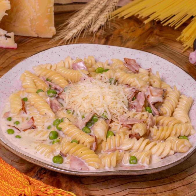 O 'Fusili à Parisiense' é uma deliciosa opção de nossos 'Pratos à la Carte'. Este prato é perfeitamente composto por macarrão Fusili, cuidadosamente cozido até o ponto ideal. Acrescentamos ervilhas frescas e presunto de alta qualidade, que dão um toque único e sofisticado ao prato. A finalização fica por conta do molho Bechamel, feito de forma artesanal, e uma generosa porção de nata fresca, que proporciona uma cremosidade inigualável. Uma verdadeira viagem gastronômica à Paris, em cada garfada!