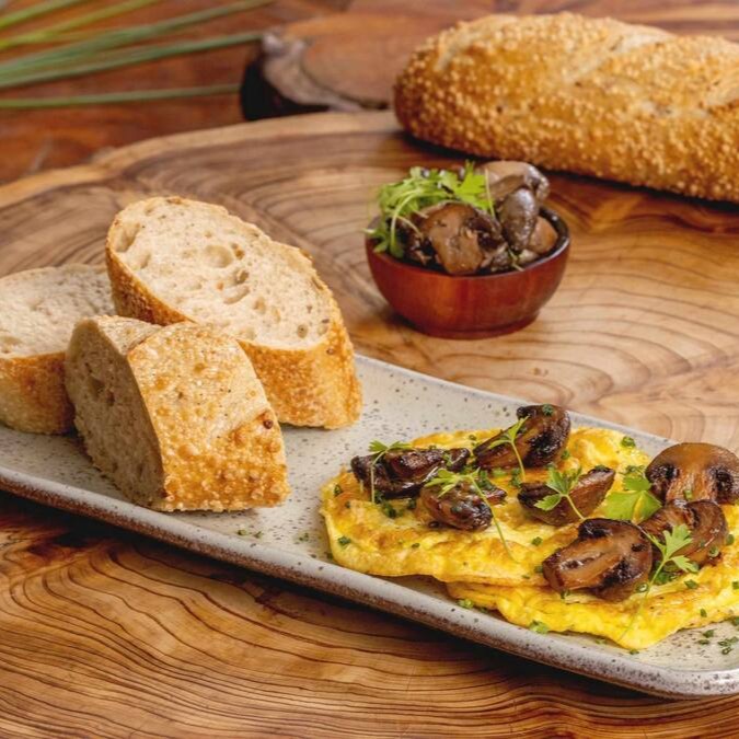 São 2 omeletes, com cogumelos Paris, acompanha 3 fatias de baguete rústica
