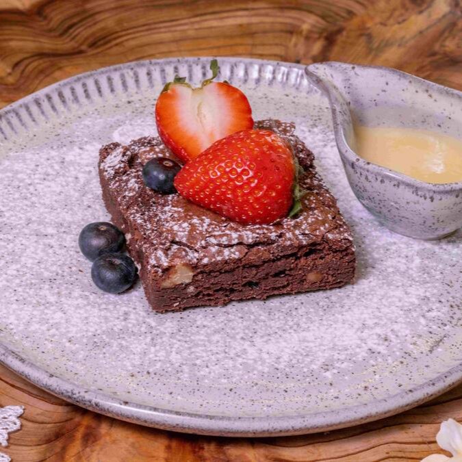 Delicie-se com nosso irresistível 'Brownie com Frutas Vermelhas e Ganache de Chocolate Branco'. Uma sobremesa de textura aveludada e sabor inigualável, que combina o brownie decadentemente rico e úmido, com a suavidade do ganache de chocolate branco. A adição de frutas vermelhas frescas e suculentas dá um toque de frescor, criando uma explosão de sabor em cada mordida. Esta é a perfeição em forma de sobremesa, feita para encantar o seu paladar e finalizar sua refeição em grande estilo.