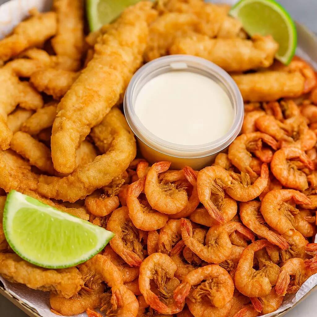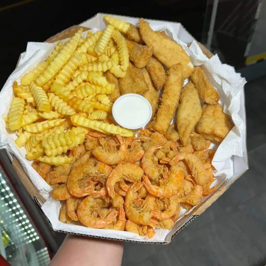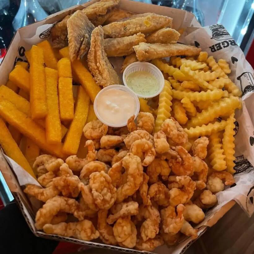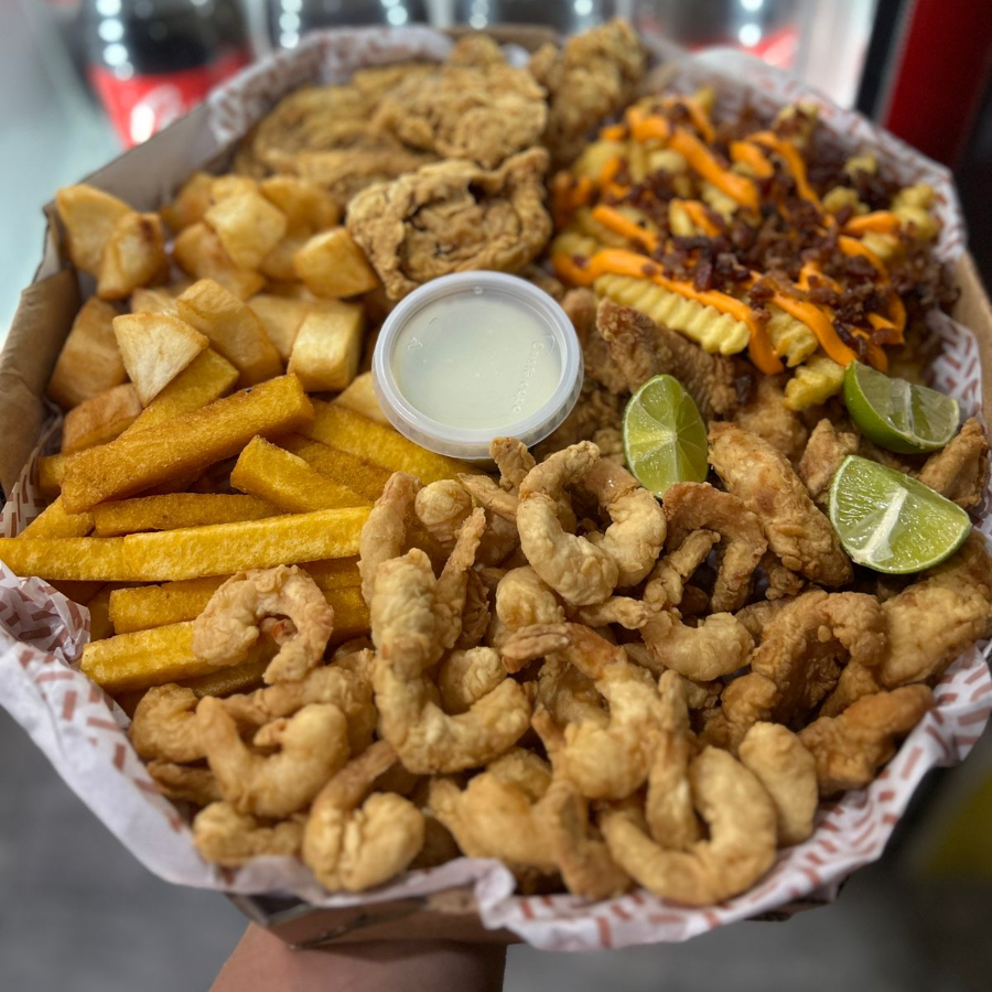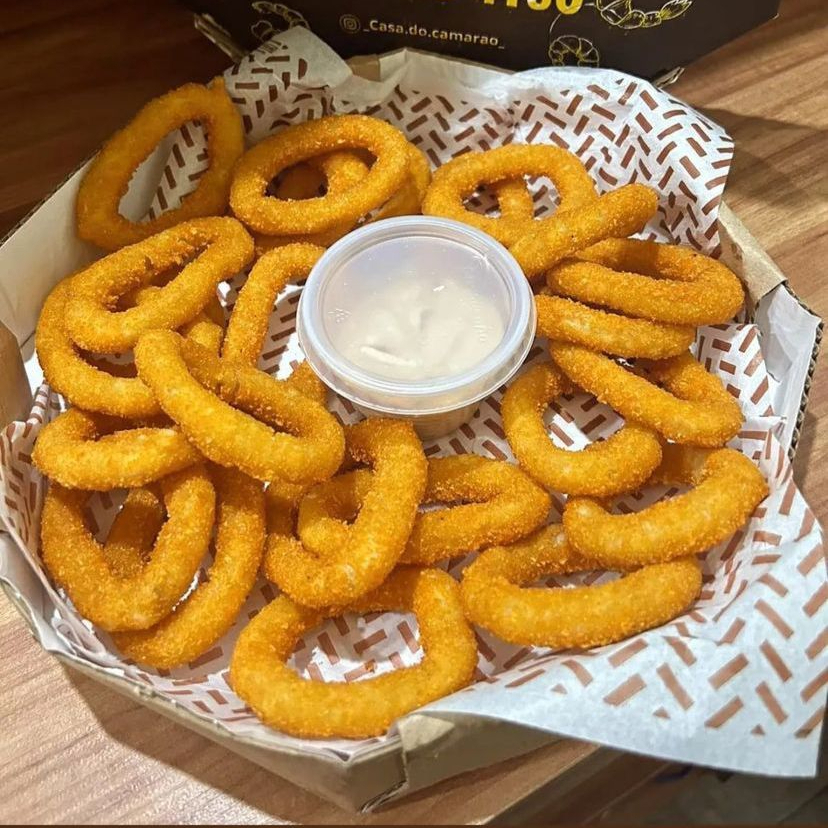 Camarão rosa sem casca, frango americano, anéis de cebola e batata frita com catupiry aproximadamente 850gramas de porção.