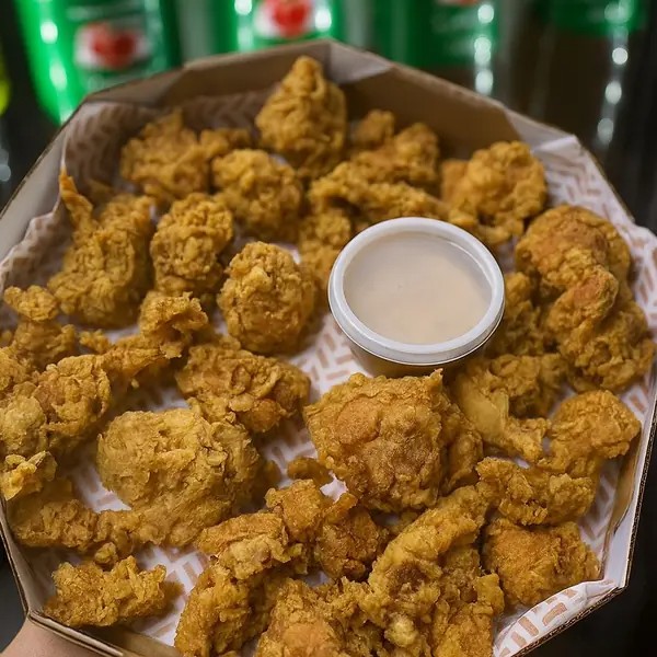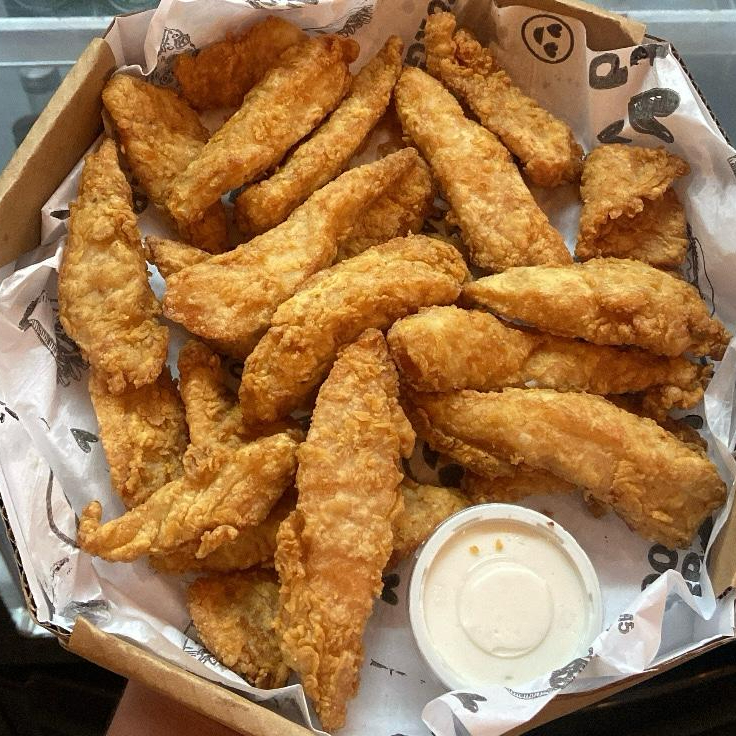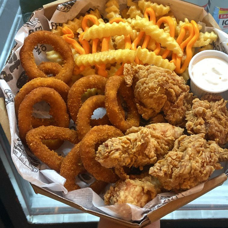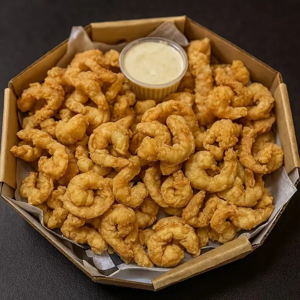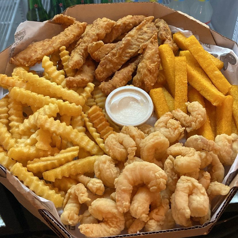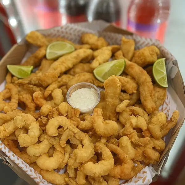 Camarão rosa sem casca, frango americano, anéis de cebola e batata frita com catupiry aproximadamente 850gramas de porção.