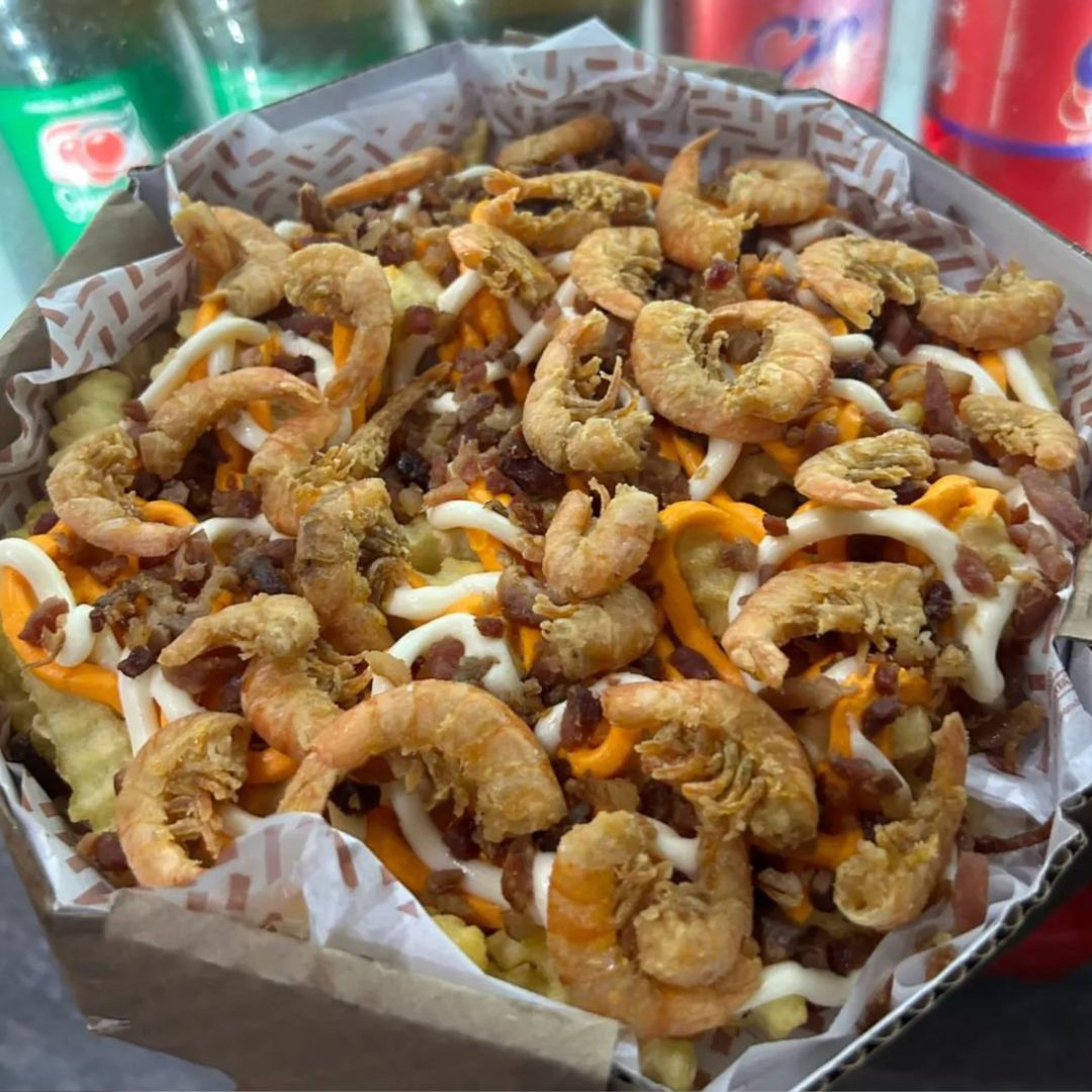 Batata frita com cheddar, catupiry, bacon e camarão. Aprox 600 gr. gr.