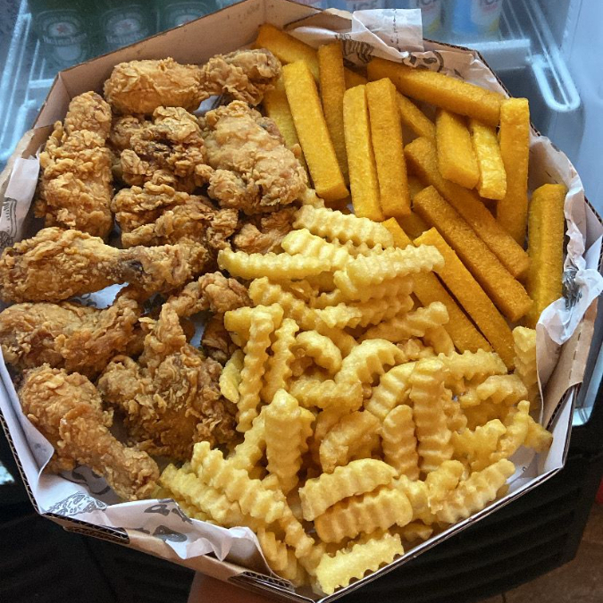 frango americano, batata frita e polenta.aprox 850 gr.